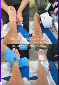 La propia Daniela compartió imágenes de su pie recibiendo tratamiento kinesiológico. Las acompañó con un mensaje que reveló su preocupación: “Guapirulis, me estoy cuidando full mi esguince para poder bailar Pole Dance”. En las fotos se aprecia el pie vendado y conectado a electroterapia, lo que evidencia la gravedad del problema.